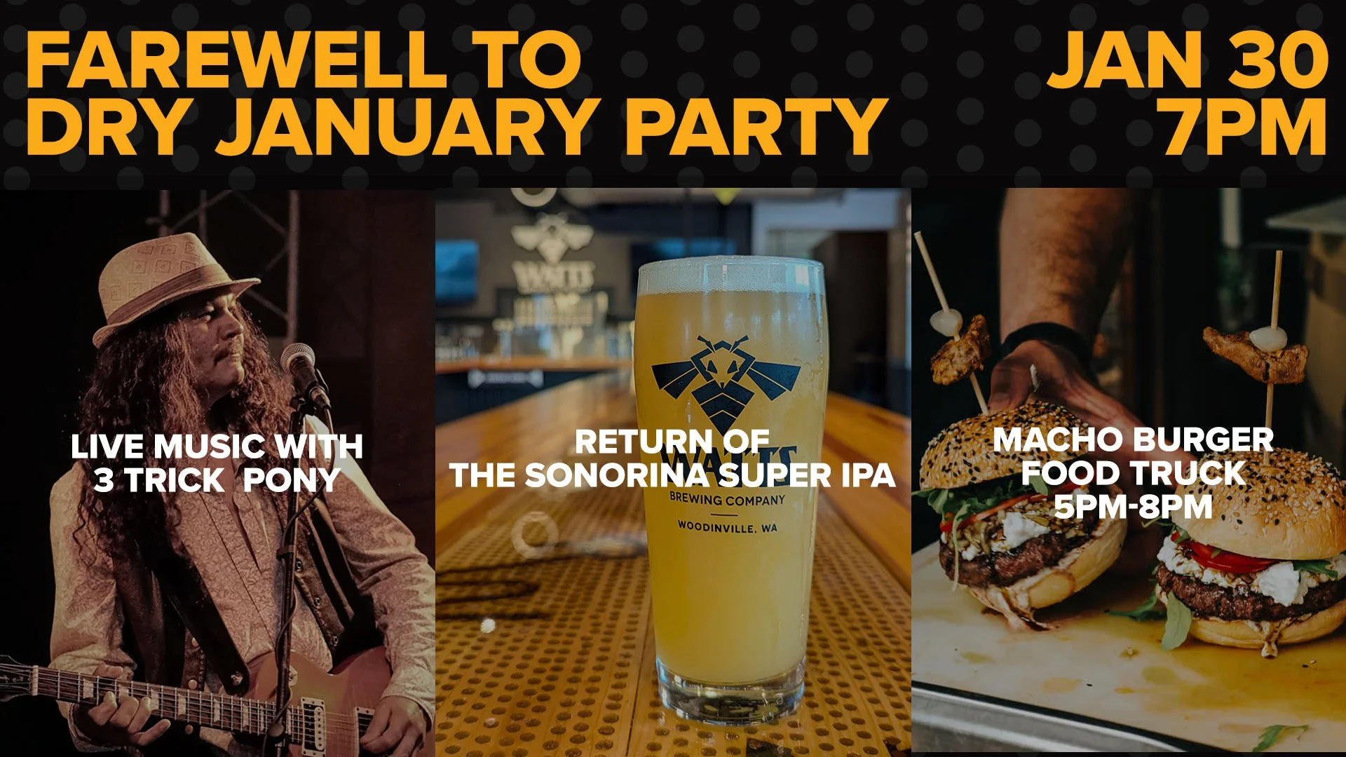 We’re excited to bring this monstrosity back to the menu, with fanfare provided by 3 Trick Pony. These guys are high energy three-piece band plying anything from classic rock to funky dance tunes, R&B, Motown, disco, and blues. Music starts at 7 pm, but get in early to grab a pint of Sonorina and a burger from the Macho Burger truck.